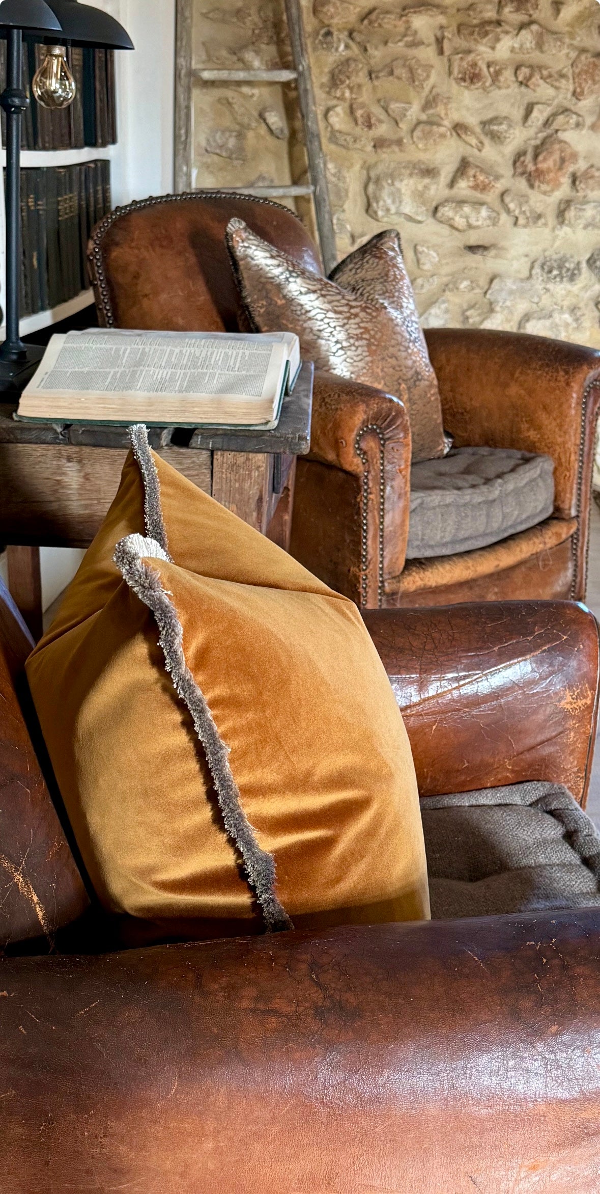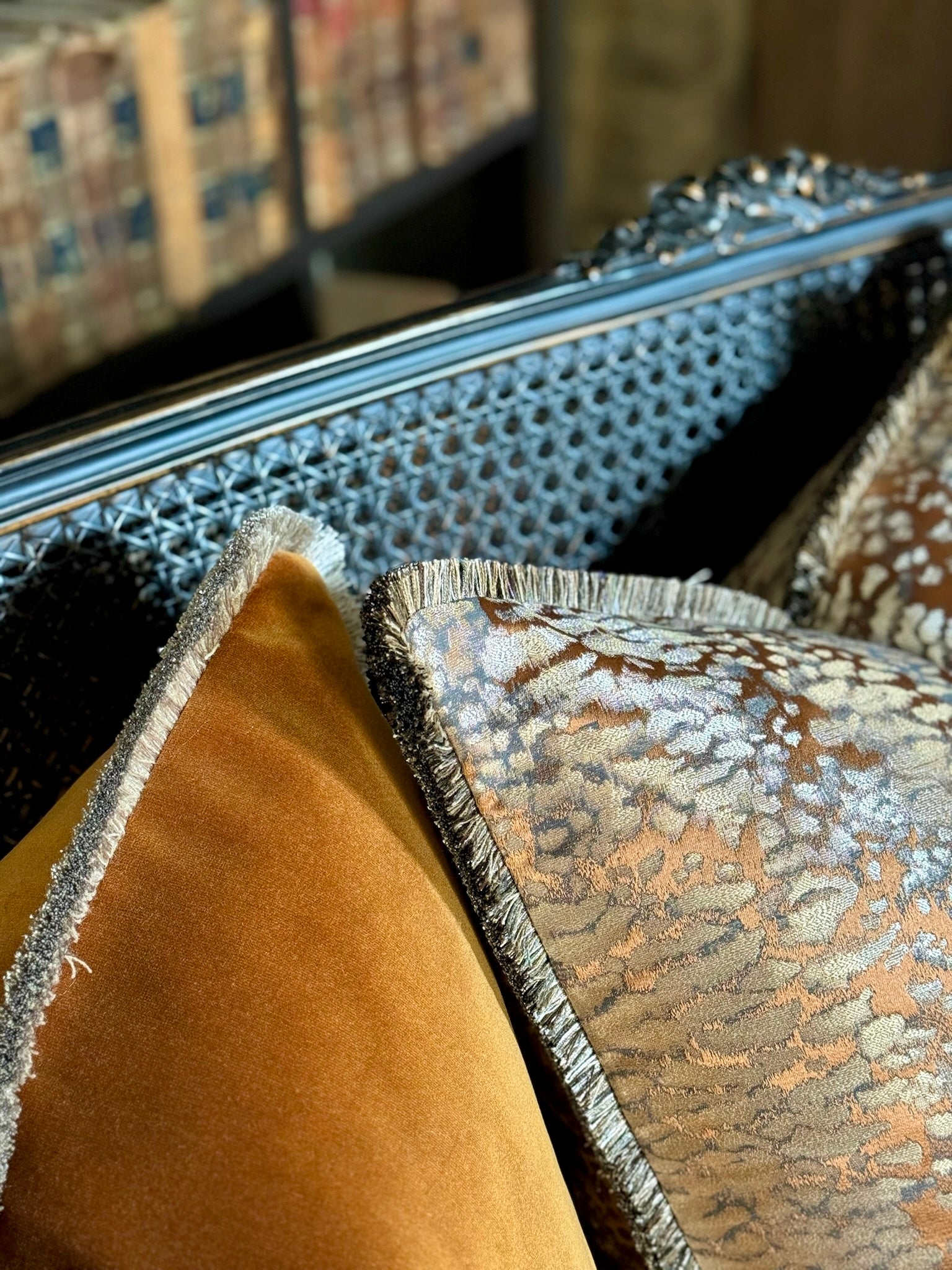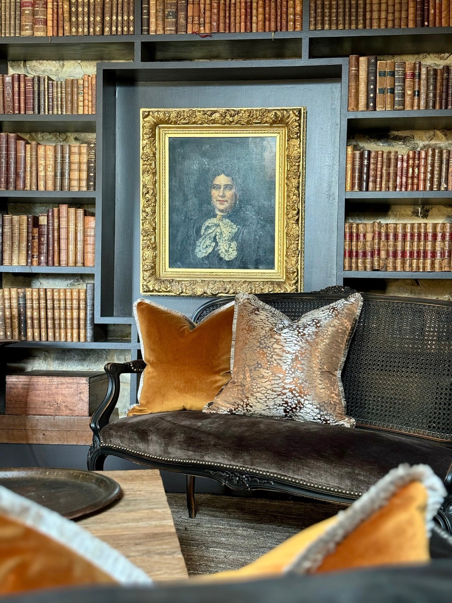 Take inspiration from the sophisticated surroundings of the library at Villa La Cavalerie! We love the dark colors, book filled walls, antique pieces and cozy seating groups filled with luxurious pillows in bold earthy tones. Shop the look below...
