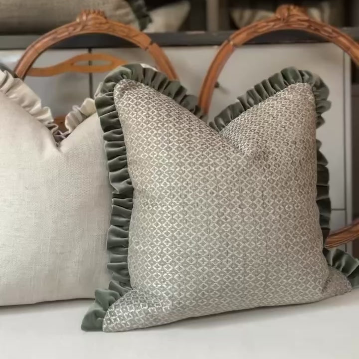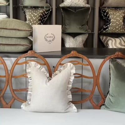 Bølgekant RomantiskEn vakker pute i en lys, varm champagnefarge med tydelig linstruktur. Den romantiske bølgekanten i hvitt og lys beige med uregelmessige striper gir et mykt og sommerlig uttrykk. Puten tåler å stå alene, men som også er enkel å kombinere med andre tekstiler. Bølgekanten rammer puten inn og gir form uten å bli streng.